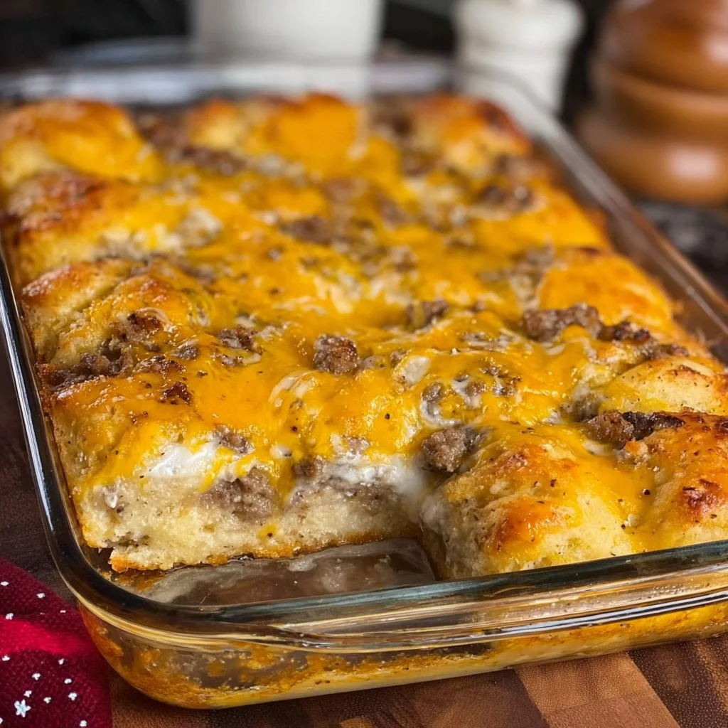 A warm and comforting breakfast casserole featuring biscuits, sausage, eggs, and cheese, perfect for busy families.