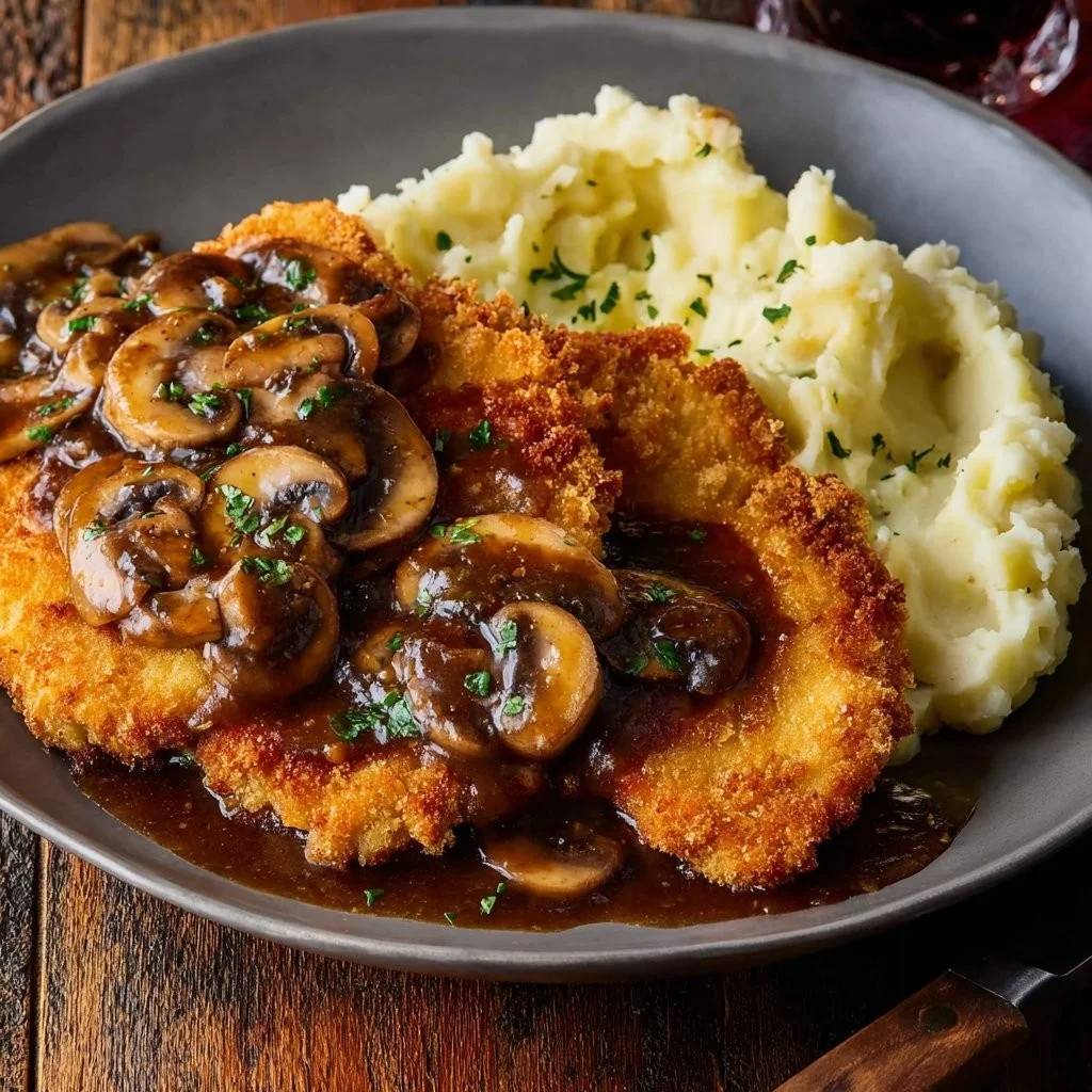 A cozy and beginner-friendly recipe for chicken schnitzel topped with a creamy mushroom gravy, perfect for weeknight dinners or special occasions.