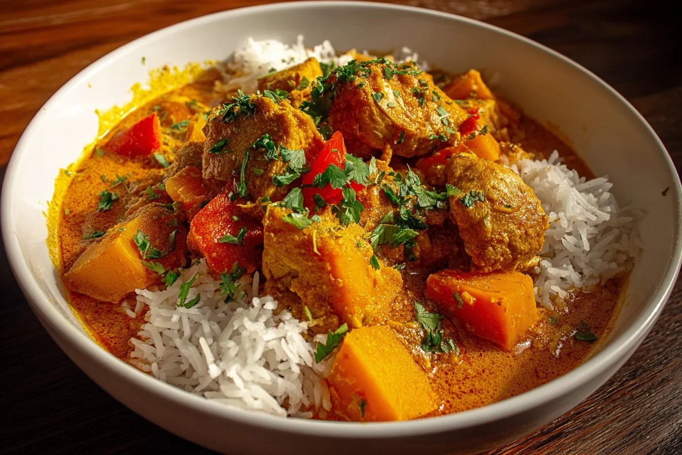 A comforting and nutritious dish made with chicken thighs, pumpkin, and a blend of spices in a creamy coconut milk sauce.