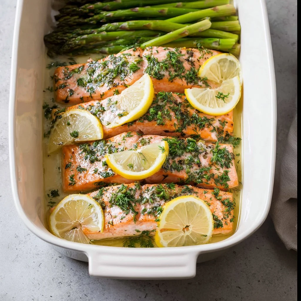 Arrange the Salmon Fillets: Gently place the salmon fillets in the dish, skin-side down. With a spoon, carefully spread the herbed butter mixture over the top of the fillets, ensuring they’re well-coated. If you’re using asparagus, arrange the spears around the salmon for an attractive, hearty side.